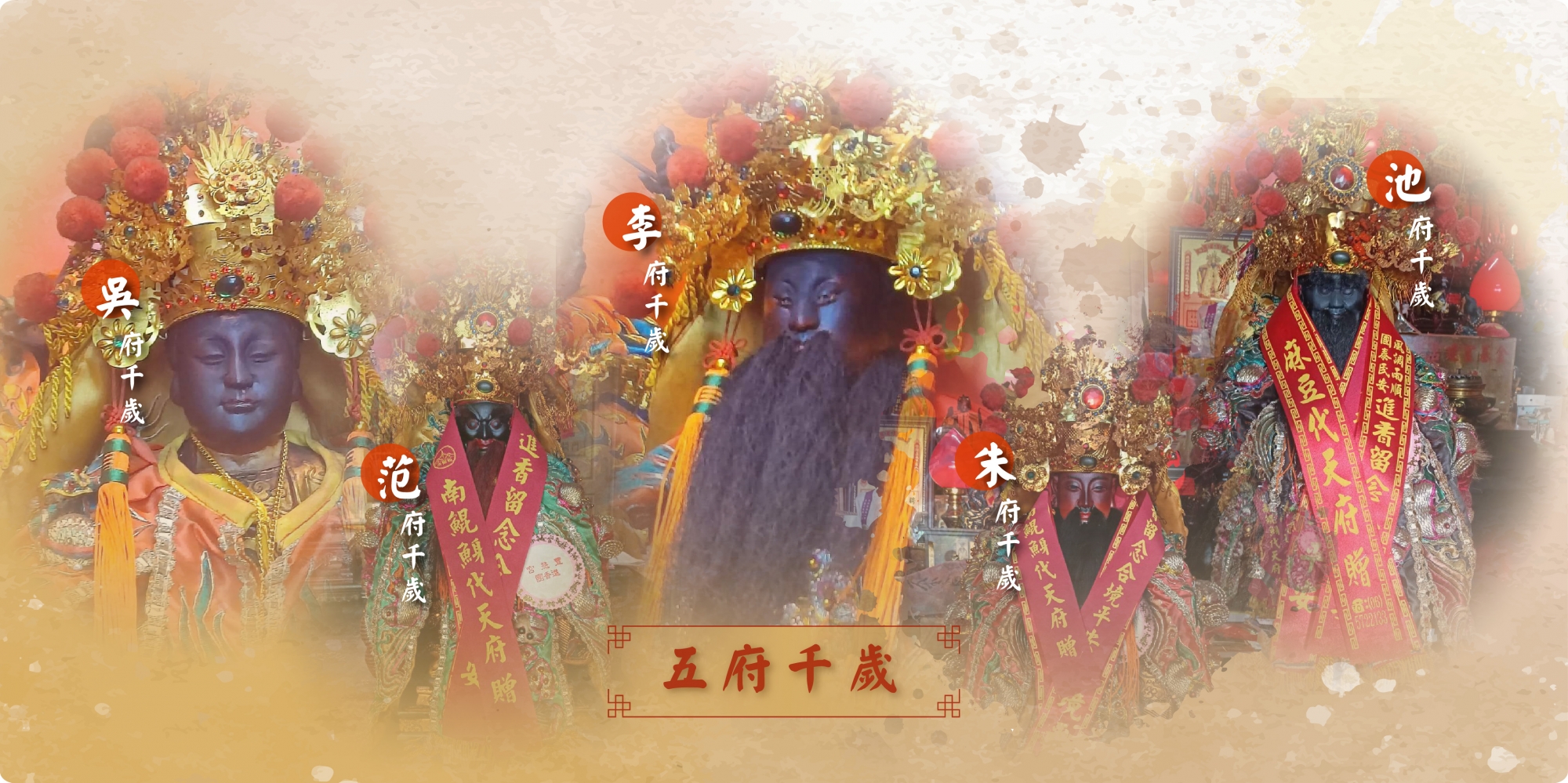 五府千歲是台灣民間信仰中極具代表性的王爺神祇,由玉皇大帝敕封為「代天巡狩」,負責賞善罰惡、保境安民,又被尊稱為「王爺公」。 相傳五府千歲原為隋唐時期的五位英雄人物——李大亮、池夢彪、吳孝寬、朱叔裕、范承業——因輔佐唐朝開國有功,死後受封為神明,巡視人間、護佑黎民。民間亦流傳他們乘王船漂抵台灣、受漁民迎奉的傳說,象徵祂們護國佑民、救苦救難的精神。 最常見的組合為李、池、吳、朱、范五府千歲,各司其職、神力分工: