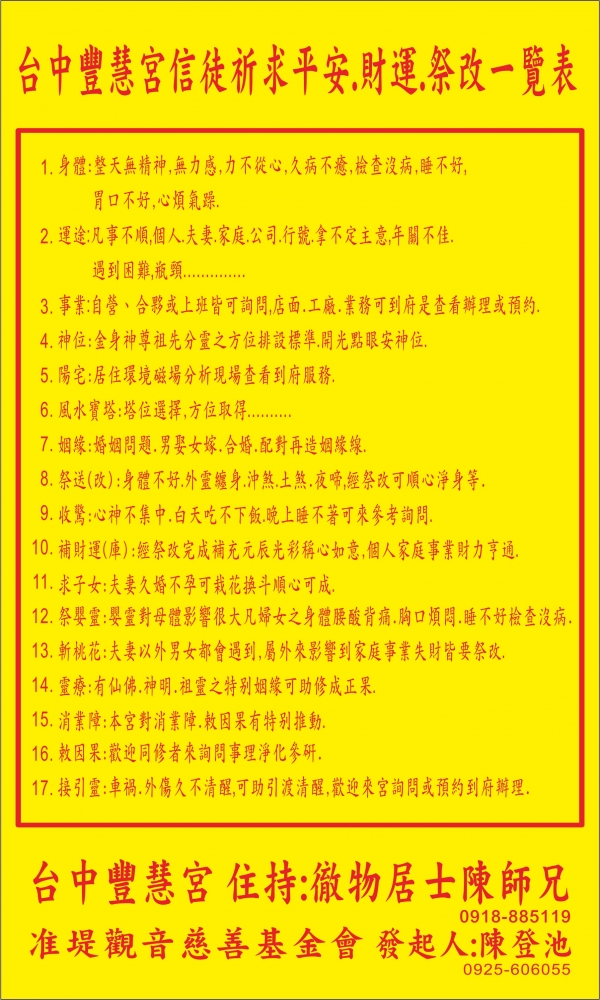 • (每日辦理:問事(事業、身體、感情、婚姻等等)、收驚、祭煞、疑難問題)