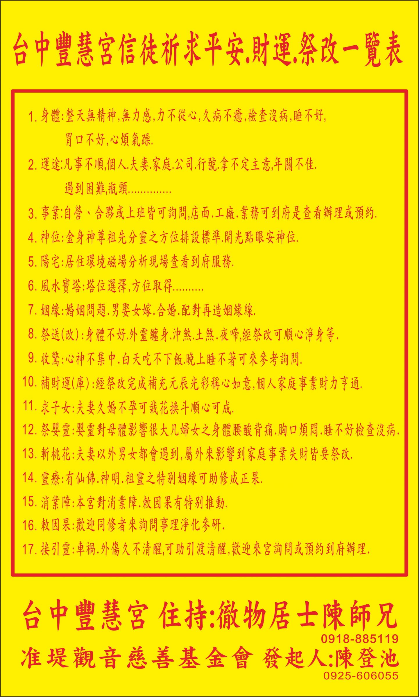 台中豐慧宮 信徒祈求平安、財運、祭改一覽表